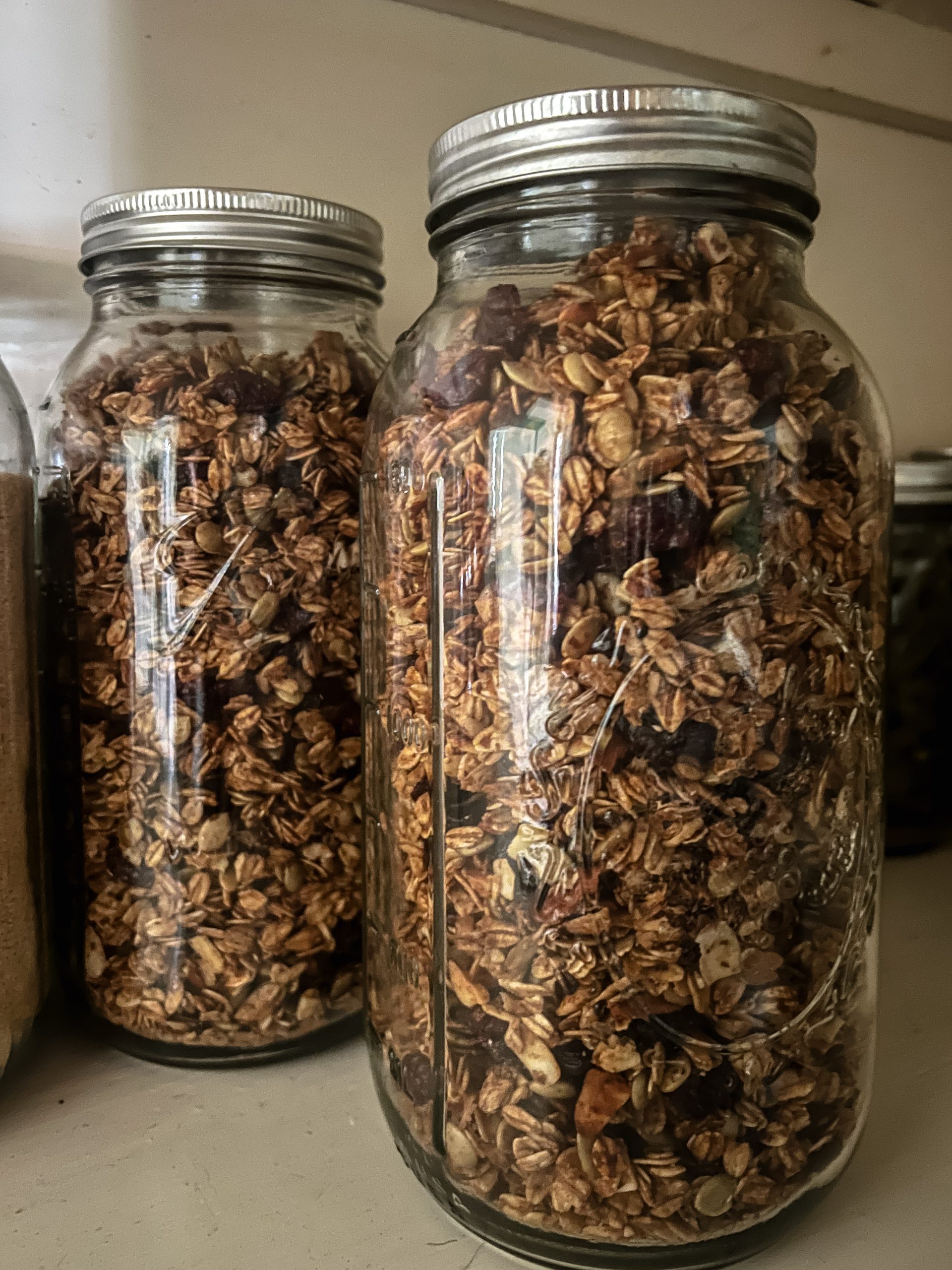 Once dried fruit is mixed in to your freshly baked granola, let it cool. Once cooled, add to a container and store. You might have to break up some of the larger chunks at this point. I store my homemade granola in half gallon mason jars.
